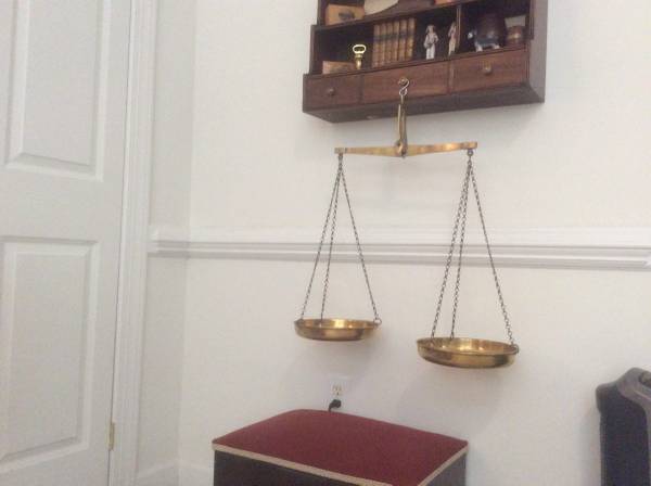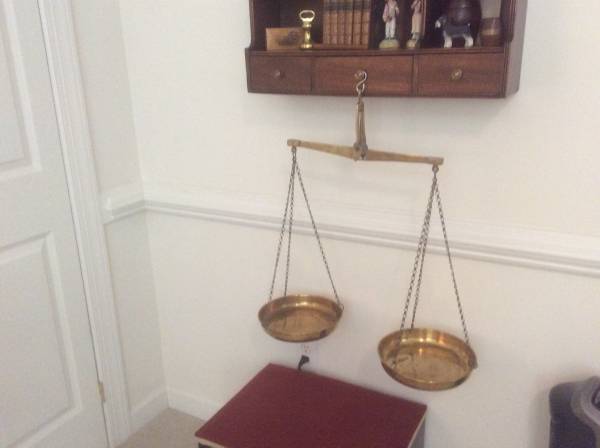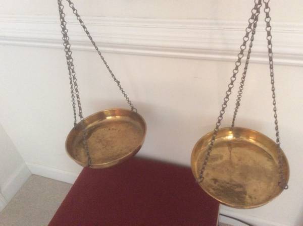 There are all kinds of vintage markings on the two hanging pans and the beam bracket.