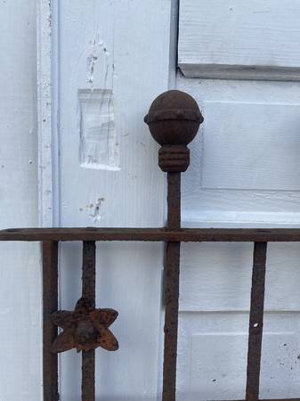 This "Turn-of-the-Century" iron gate features over-sized cat iron ball finials and floral design elements in original condition. The original mounting hardware and latch are intact and included.