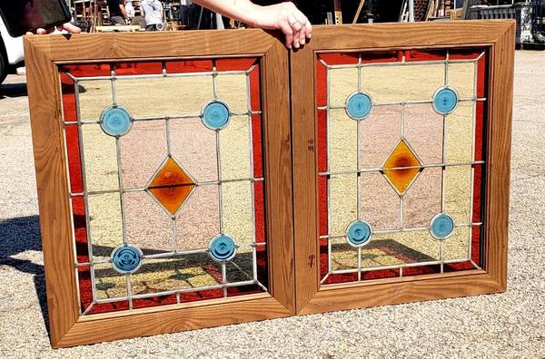 These windows have great geometric designs and awesome pastel colors. They both have blue rondel style accents at the center making these look different at every light beam angle. Both have newly treated frames made from Cambia Ash wood and are ready to hang. Excellent condition and free from chips, cracks and breaks.