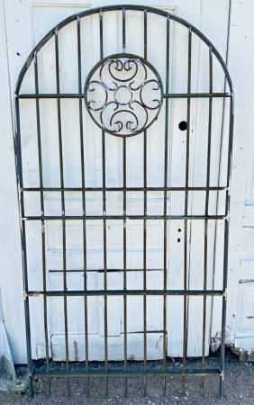 This product is a beautifully restored arched antique iron gate featuring a stunning flower medallion design. The gate is a unique architectural piece that adds a touch of vintage charm to any outdoor space.