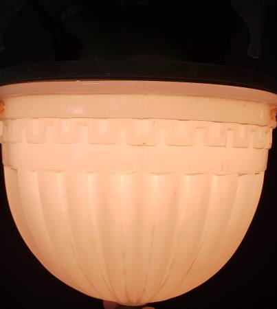 We've restored this unique ceiling fixture by updating all of the wiring/sockets and gave it a newer shade. The hexagon shaped base is all bronze with ornate rope twist top trim and ornate corner brackets. The updated globe is off white/opaque and heavy duty with a center bottom matching finial. The shade also has a textured surface with it's own ornate design throughout.