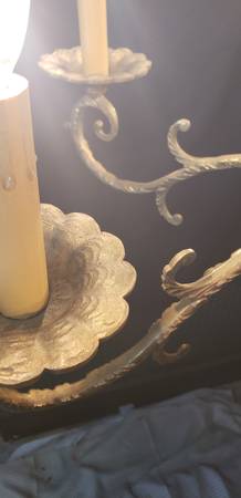 Each light assembly has a beautiful scalloped stamped bobeche'. It also has 12" chain and a matching ceiling cap. Shown with 6-40 watt regular bulbs.