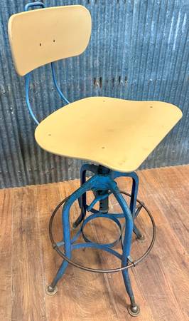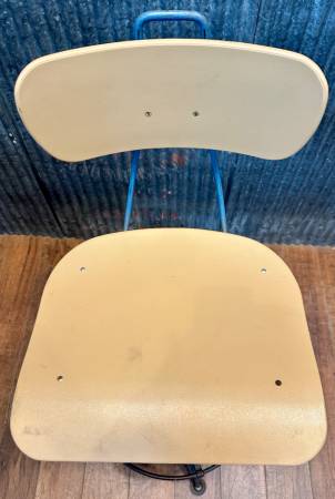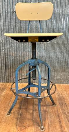 This Toledo Metal Furniture Co. Work Stool is a vintage piece with a steel spider base and a plastic seat/backrest. This stool is perfect for use as a functional and stylish addition to any workshop, studio, or industrial setting.