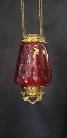 This fixture is original to the Victorian era. The glass globe has a diamond shaped design throughout the whole globe and is slightly textured. *One side of the fitter is chipped, however this is not seen once the fitters are applied. This is pictured. This fixture contains the globe, brass fitters, canopy and chains. It does not have a burner pot. The chains move freely.