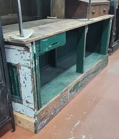 The front and sides show green & white patina bead board. The divided drawer on the left was used for money & change. The top of the counter has just two wooden boards combined.