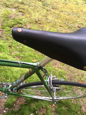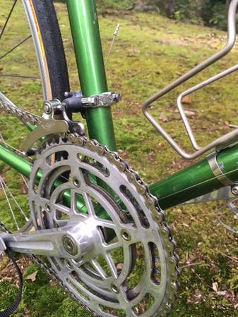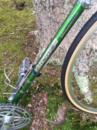 Rare lime-green 1971 Tour de France racing bike in excellent condition. The frame is large-size 63cm hand-brazed Reynolds 531 steel-magnesium alloy, with Prugnot lugs. A few minor nicks but no dents, rust, or gunk. Stock, except for the handlebar quill-stem, new chain, and UKAI clincher-wheels with Panasonic Panaracer tires (the original wheels are also included; which are Mavic Monthlery tubular rims with Normandy Luxe hubs and Continental sew-up tires, all in good condition). This bike is a 10-speed with a STRONGLITE Super Competition 93 crankset and SIMPLEX Criterium derailleurs. Shifters are of the down-tube friction type, and work perfectly in all 10 gears. Brakes are MAFAC Racer. The IDEALE leather-seat is in great condition. The bike is fully-functional with smooth bearings lubricated and adjusted. This 100% French vintage bike is a dream to ride. Quite smooth and fast and comfortable. It is also a Collector's bike at a bargain price. As shown in the pictures, the bike is adjusted for me at 6'3". The top-bar stand-over height is 35 inches, so the bike would be ideal for a rider in the 6'2"-6'4" height range.