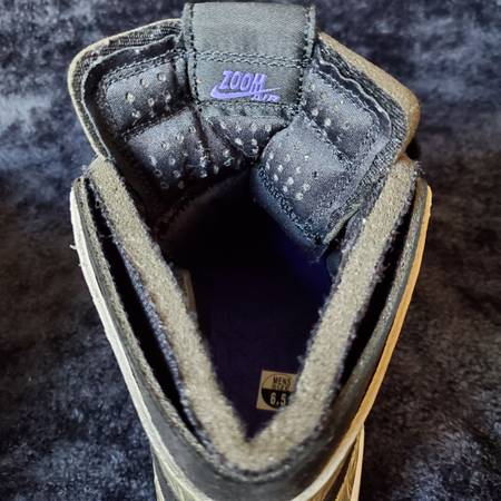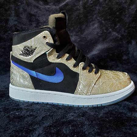 The Air Jordan 1 Zoom Air CMFT Gold Laser features a black Durabuck upper with laser-etched metallic gold overlays and metallic royal blue inset Swooshes. From there, a tongue with exposed foam edges and a Zoom midsole with a semi-translucent outsole completes the design.
