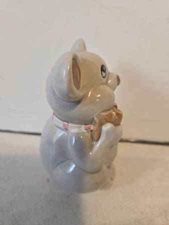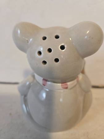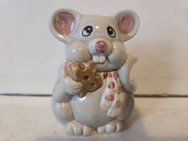 This vintage glazed ceramic hungry mouse salt shaker stands at 4 inches tall and features a polka dot scarf, adding a fun and kitschy touch to any kitchen decor. The gray color, animal shape, and unique design make it a charming addition to any collection of salt and pepper shakers. Perfect for all occasions, this original piece is sure to bring a touch of whimsy to your dining table.