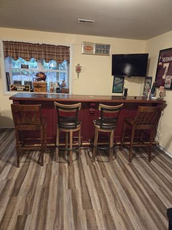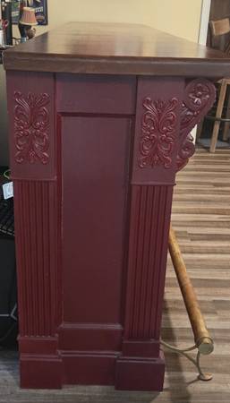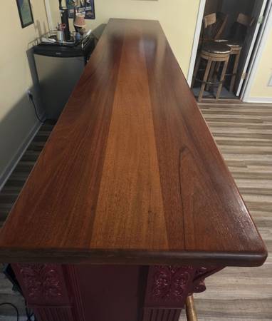The bar top is 10ft long and 2ft wide. Top is 2 inch thick solid mahogany from reclaimed wood. Front and side are early 20th century pocket doors turned side ways. Foot rail is brass but not antigue, however the foot pedestals are . Back side has shelving on one half and open the other half for a kegorator or trashcan etc. This is a very solid and heavy bar. Top can be removed.