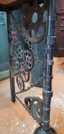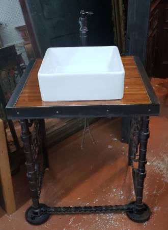 This vessel sink top vanity was made in our shop using reclaimed and new materials. The sides of the vanity were created from salvaged gears, chains, pistons, wrenches and more. The top wood base (2 1/2" thick) has reclaimed bowling alley flooring which was cut to size then coated with spar urethane. A thick steel band then was wrapped around all sides and secured. The sink is permanently attached to the wood top. The wood and machinery were salvaged from homes in historic Richmond, Virginia.