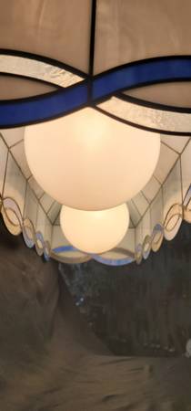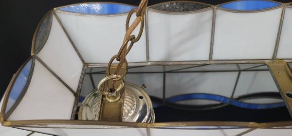 Very bright and beautiful ceiling fixture with geometric cobalt blue and Florentine glass swirls. White swirly glass is at the top framed in brass and lead. The top has fluted scalloped trim with 24" of wire and chain that meet at the top center ceiling cap which is brass, round, and 6" in diameter.