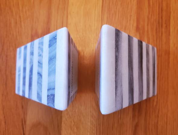 Decorative pair of striped triangular shaped heavy duty marble bookends handcrafted in India. Made with interlocking layers of black and white marble. No chips or damage. Great gift for the book lover in your family. 6"h x 3-7/8"l x 2-7/8"w. One is slightly taller than the other by about 1/8". Cash only. No payment apps please.
