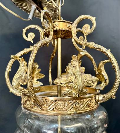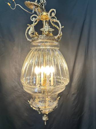 Elevate the ambiance of your space with this elegant antique solid brass and crystal 4-light chandelier. This is a large light fixture, measuring at 47 inches in circumference, 15 inches in diameter, 36 inches tall, and includes a 2 ft chain with a really nice brass canopy. The chandelier features a crystal shade with ornate, brass hardware.