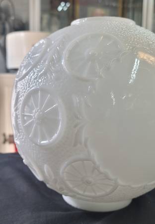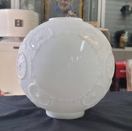 Unique solid white globe with textured & embossed designs. Excellent condition with no chips, cracks, breaks. Measures 9 1/2" in diameter & 10" tall with a 3 7/8" fitter. More info/or to...