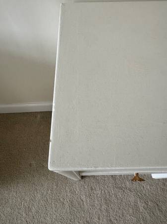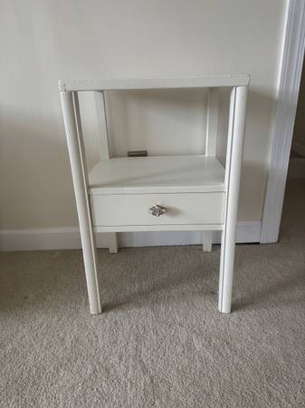 This listing is for a painted nightstand that is off-white in color. It has one drawer. It's from the 1950's and if striped, will come back to its original aesthetic that doesn't have any wood chips. It measures 16d x 18w x 28.5h. There are some paint chips. Asking $50.00 cash only. Please contact me if interested.