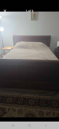 Queen bed, mattress, dresser with mirror, and night stand