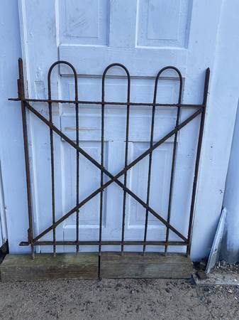 This is an antique, 5-hoop hairpin gate. The original hinge and latch setup are intact and included.
