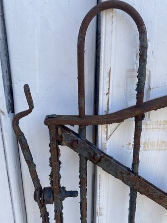 This uniquely tall, 3-hoop hairpin gate features a steel cross-strap design with a pressed tin floral medallion. The original hinge and latch hardware are intact and included.