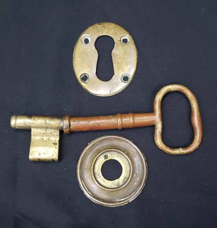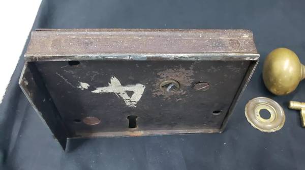 This set is all original and includes: Lock, two knobs, center spindle and set screws, side keeper, brass rosette, brass keyhole escutcheon, key, and screws for installation. It is a #60 Improved - model. The original brass key is bent, however it works as it should. Makers mark at the top in brass.