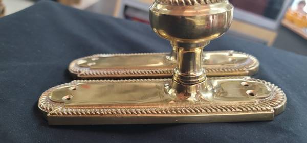These knobs and backplates are all one unit and stationary making them perfect for doors that do not have any lock mechanism or catch. There are two screw holes at the top and bottom for installing. Both have ornate rope twist trim design. We do have three pairs available should you need more than one.