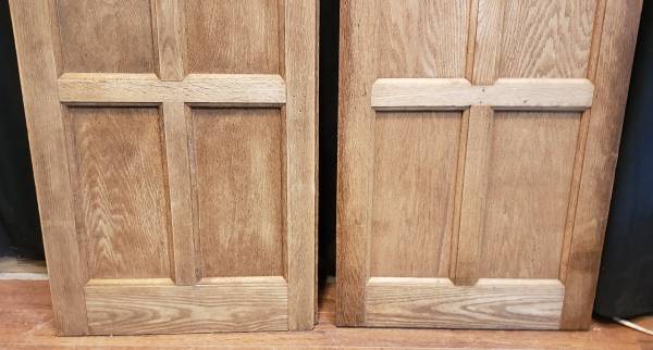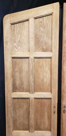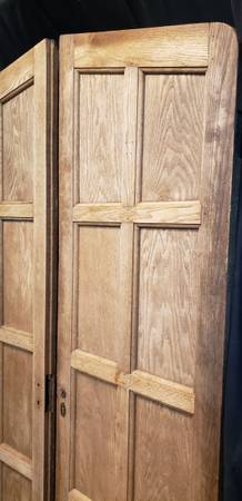 The design on these doors is certainly unique. The top has an inverted arch meeting at the top center. They are solid oak and have recently been stripped and removing many layers of paint.