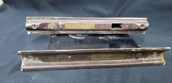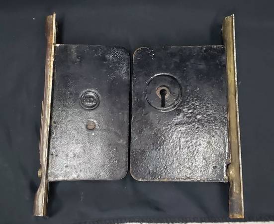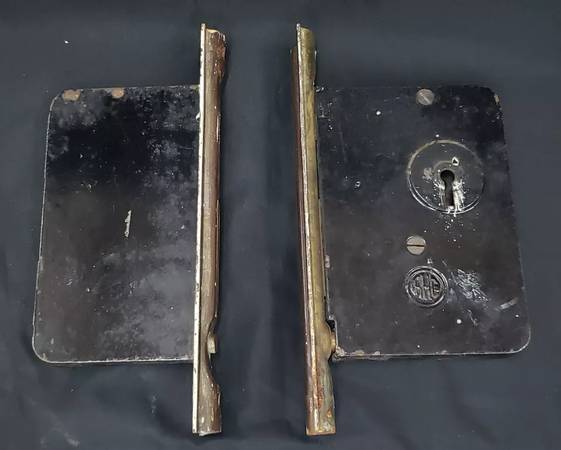 The locks are made by Corbin and are working lock sets. This set was salvaged from a historic homesite in Richmond, VA. It has remaining paint on the brass areas as well as the escutcheon plates.