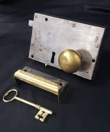 This left side carpenter style rim lock set was restored by our Brass Foundry with adjusting the interior mechanisms, creating a working key, side keeper, round rosette and knobs. The box lock was also wire wheeled to its metal. The set includes: Lock, keeper, key, two round knobs, center spindle, set screws and round rosette.