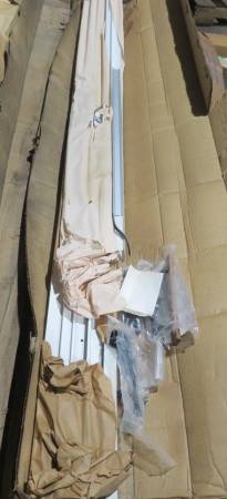 White Aluminum Exterior Sliding Insulated Glass Doors New Unused Old Stock Complete Door Panels with Frame and Hardware Door Frame is Unassembled in Cardboard Box / Assembly Required 5 foot wide x 6...